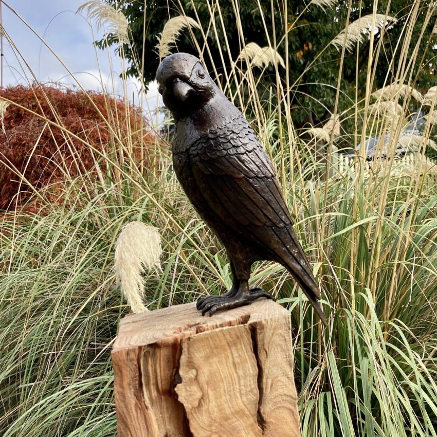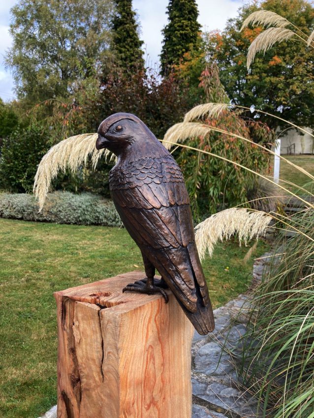 The Karearea (New Zealand Falcon), is watching and waiting patiently to pounce. Mounted on a sandblasted macrocarpa post, this sculpture can work just as well inside or out of doors.